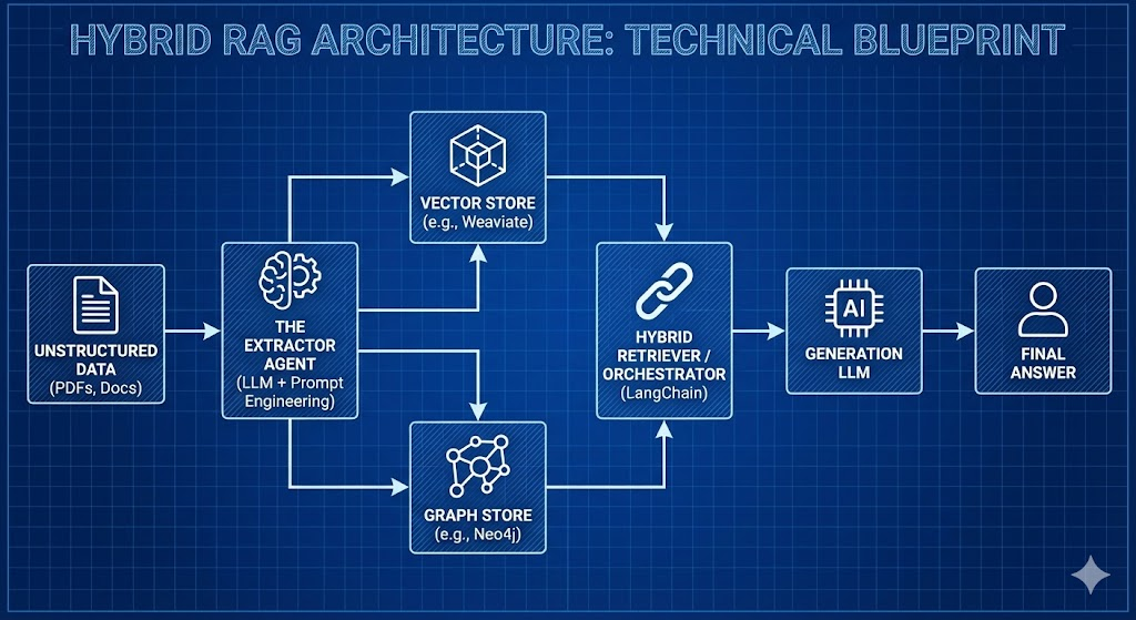 - Parallel Execution: The system runs a vector search to find broadly relevant documents AND a graph traversal to find specific connected entities.